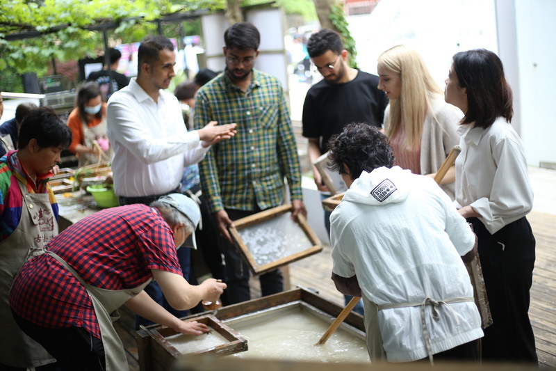 在上海这座国际化大都市办学,华理国际教育学院也学习并思考着如何向留学生这个特殊群体讲好中国故事,传承中华文化之美,搭建文明互鉴之桥。“通过前期调研发现,国际学生除了在课堂上学习中国文化,非常希望在生活中体验中国文化,而社区学校也需要更多海内外受众传承推广非遗文化。”院长、党支部书记李霄鹏表示,最近一个主题党日,学院在周边凌云社区学校启动国际学生文化实践基地建设,让“一带一路”上首批20多名留学生与社区教师和志愿者一起,体验古法造纸、饾版印刷、“多层纸艺——萌宝熊猫”等项目,一同培养知华、友华国际化人才。