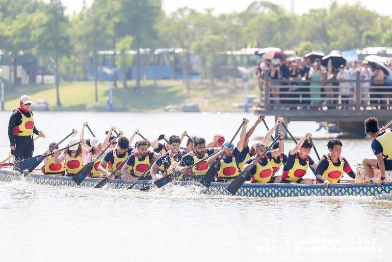 祈福、点睛、竞渡,浓浓的中国风,满满的国际范儿。一样的是龙舟,不同的是各种肤色、各种语言的竞渡人。龙首沉浮,水花四溅,一条条龙舟在水面上劈波前行。桨声击水催奋进,如矢箭飞掠波澜。在速度与激情的交锋中,在啦啦队的呐喊助威中,经过紧张激烈的预赛、决赛,最终华东师范大学队拔得头筹;上海海事大学、同济大学获得二等奖;复旦大学、东华大学、南京林业大学、中国科学技术大学、浙江大学获得三等奖。