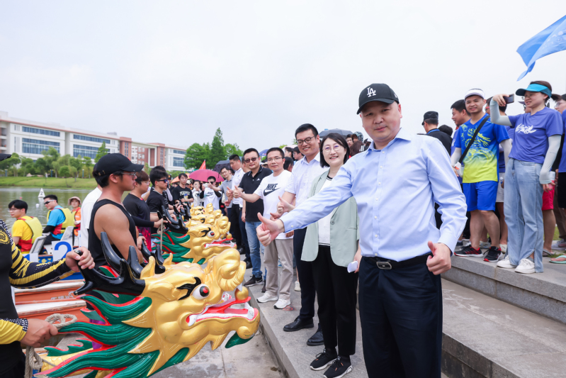 与会嘉宾共同为参赛龙舟点睛,寓意和谐幸福、国泰民安。商学院副院长楼高翔宣布正式开赛。