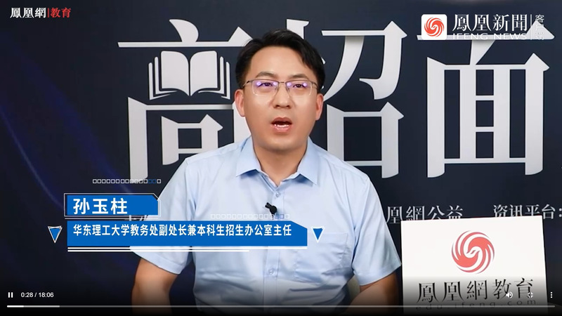2023年凤凰网教育、凤凰网公益主办的“高招面对面”全国百所名校高招直播宣讲会启动。华东理工大学教务处副处长兼本科生招生办公室主任孙玉柱介绍了华东理工大学多样化的人才培养模式,学校致力于培养具有国际视野的复合型创新型人才。为学生搭建多层次、宽领域的国际交流平台,给学生提供全面发展的机会。