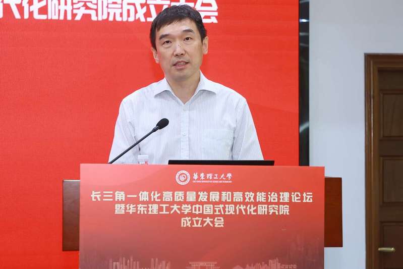 6月9日,长三角一体化高质量发展和高效能治理论坛暨华东理工大学中国式现代化研究院成立大会在华理徐汇校区举行。上海市人民政府发展研究中心党组成员、副主任严军,华东理工大学党委常委、副校长阎海峰,复旦大学文科资深教授、经济学院院长张军,华东理工大学社会科学高等研究院院长吴柏钧,上海市人民政府发展研究中心社会发展处处长吴苏贵,华东理工大学人文社会科学处处长范体军共同为中国式现代化研究院揭牌。