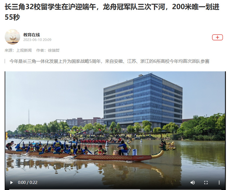 【上观新闻】长三角32校留学生在沪迎端午,龙舟冠军队三次下河,200米唯一划进55秒