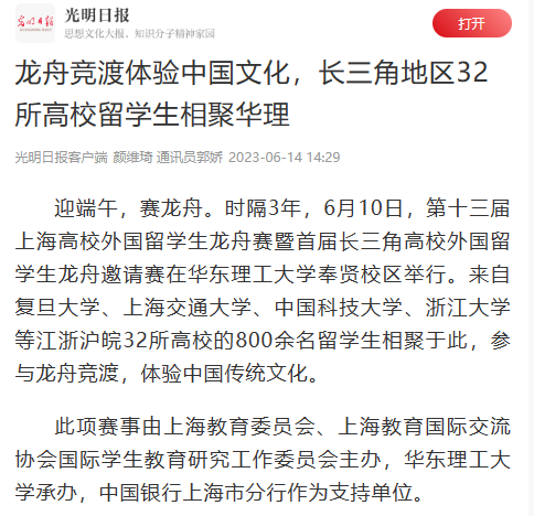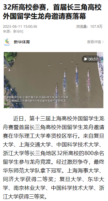 6月10日,第十三届上海高校外国留学生龙舟赛暨首届长三角高校外国留学生龙舟邀请赛在我校奉贤校区举行。来自复旦大学、上海交通大学、中国科技大学、浙江大学等江浙沪皖32所高校的800余名留学生相聚于此,参与龙舟竞渡,体验中国传统文化。新华社客户端、人民网、光明日报客户端、中国教育报客户端、中国青年报客户端、China Daily、Shanghai Daily、上观新闻、中国新闻网、澎湃新闻客户端、文汇APP、东方财经、新民晚报、新民周刊、青春上海、东方网、劳动观察、上海教育新闻网、上海教育电视台等20余家媒体对此进行了报道。本篇选取部分报道予以转载。