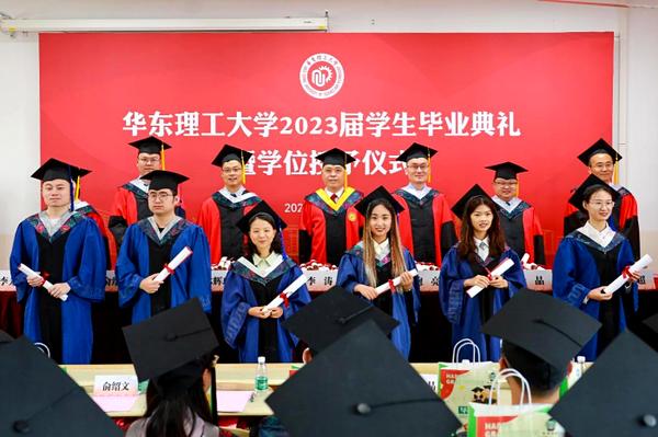 6月16日,华东理工大学2023届学生毕业典礼暨学位授予仪式在徐汇校区逸夫楼报告厅等25个会场同时举行,学位授予仪式上,校领导与学院领导共同为2023届毕业生拨穗正冠,并向毕业生赠送毕业纪念卷轴。