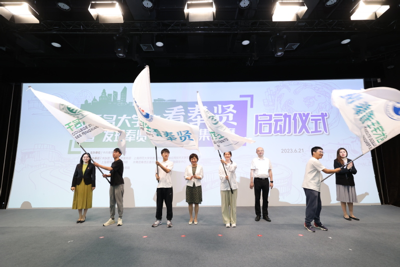 启动仪式现场为华东理工大学、上海师范大学、上海应用技术大学、上海商学院等4所高校授旗。我校社会与公共管理学院2020级本科生李煜桐作为高校学生代表发言,上海师范大学附属奉贤实验中学副书记、副校长包蓓姹作为在奉工作代表发言。