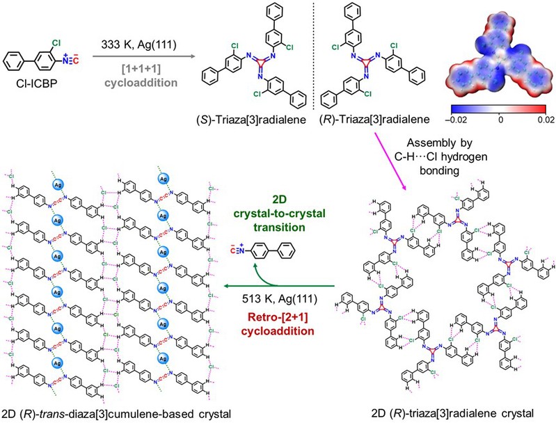课题组成员通过异腈的表面[1+1+1]环加成反应,原位制备了基于C–H···Cl氢键作用的二维三轴烯晶体,并发展了高化学选择性和立体选择性保持的逆-[2+1]环加成反应,实现了从异腈向三轴烯到累积三烯二维晶体的定向转化。通过扫描隧道显微镜(STM)和非接触原子力显微镜(nc-AFM)直接观察到了多种二维晶体转变过程中的关键反应中间体,并结合理论计算阐明了逆-[2+1]环加成反应涉及三元碳环的开环、次序性的脱氯/氢钝化和脱异腈的过程,并且发现三轴烯到累积三烯二维晶体转化是一种逐步外延生长机制。