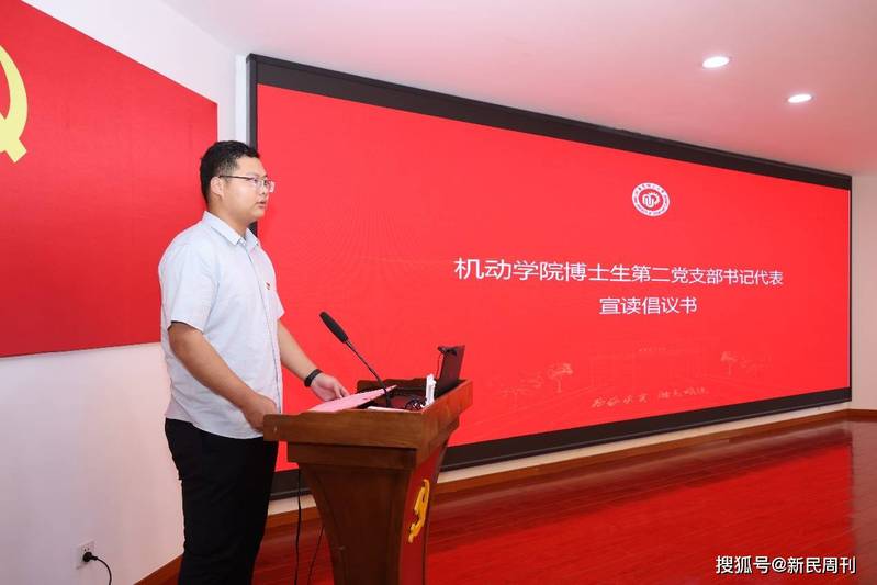 机动学院博士生第二党支部书记聂文睿代表上海市研究生样板党支部向全校党员发出《砥砺科技报国初心 勇担时代新人使命》的倡议书,号召大家高举思想旗帜,争做强国先锋;坚定理想信念,投身科研报国;努力刻苦钻研,推动科技创新。以昂扬奋进的姿态书写下无愧于时代的壮丽篇章,让青春在全面建设社会主义现代化国家的火热实践中绽放绚丽之花!