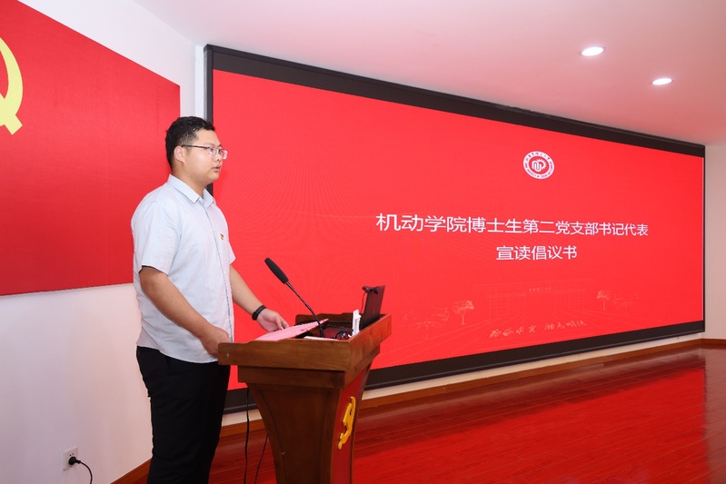 图片说明:机动学院博士生第二党支部书记聂文睿宣读倡议书