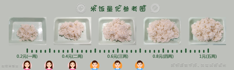 在华东理工徐汇校区一食堂,每个窗口的电子屏上,都清晰罗列着菜名,以及全份和半份的价格。在主食区,最醒目的位置留给了一块展板:不同分量的米饭,对应不同的量化参考图。一两米饭售价0.2元、二两0.4元,师生可以根据自己的饭量自选。