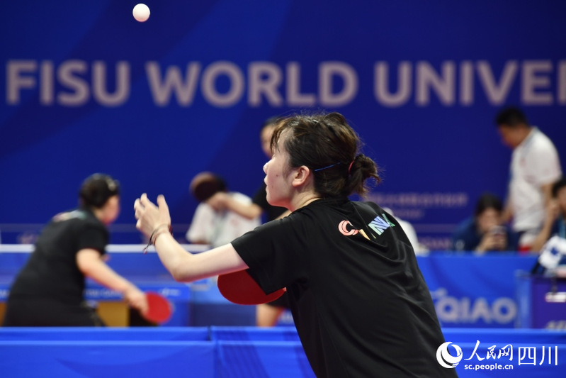 成都大运会中国代表团乒乓球运动员正在赛前训练。人民网记者 王洪江摄