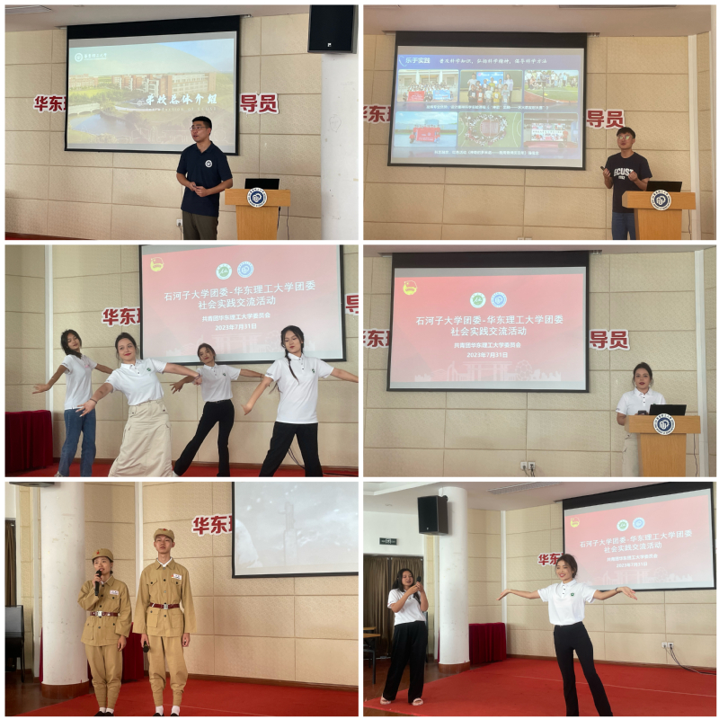 石河子大学实践团学生李凡、苏比伊努尔·哈力甫分享了本次祖国行的实践内容,石河子大学大学生宣讲团宣讲了《沙海老兵》的故事,石河子大学大学生艺术团带来了歌舞《麦西来普》、舞蹈《黑走马》。石河子大学一行还参访了华东理工大学建设成就展。
