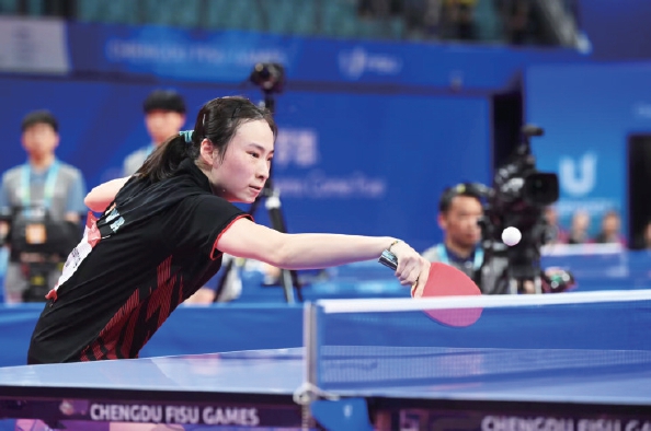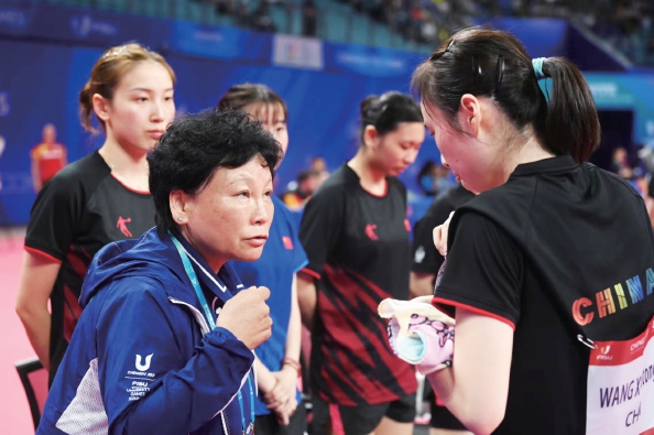 华东理工大学是本届大运会中国乒乓球队的主力军,不仅由华东理工大学负责组队参赛,华东理工大学党委副书记沈海涛作为大运会中国乒乓球队领队率队出征,教练为臧玉瑛、黄金建和马越斐,三位教练均来自华理。10名参赛队员中有五名运动员来自华理,薛飞、刘丁硕、满派、王晓彤、赵尚将分别参加男女团体、单打、双打等七个项目的比赛,他们都曾代表学校在国际、国内各项大赛中斩获优异成绩。在7月28日的大运会开幕式上,马越斐还与冬奥会冠军苏翊鸣、奥运会冠军施廷懋一同作为会旗执旗手亮相。