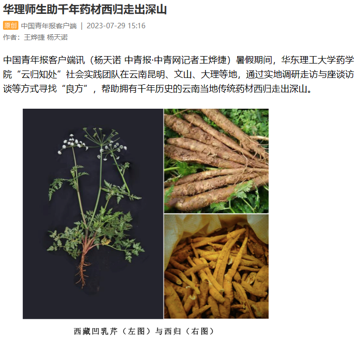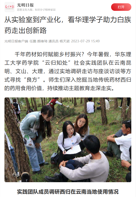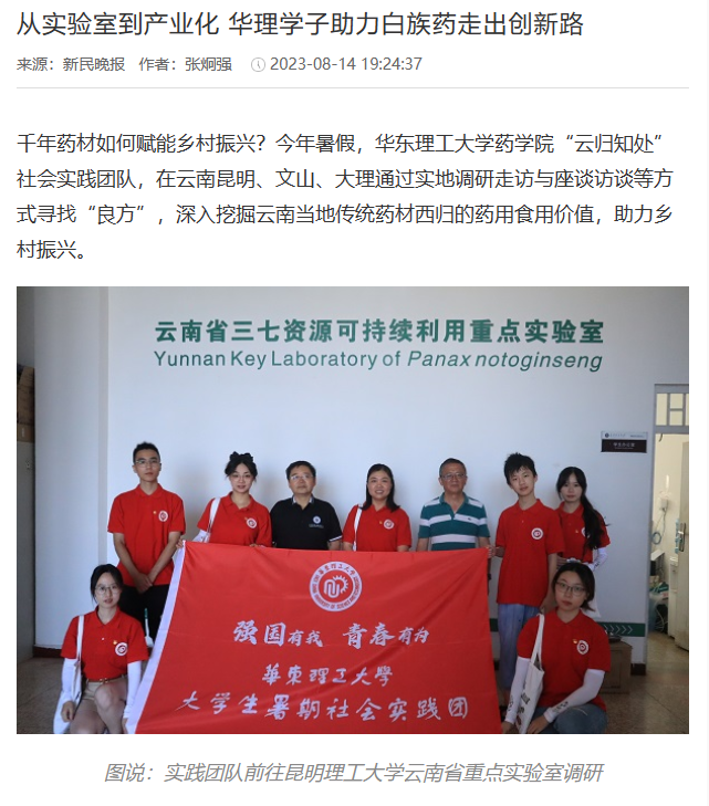 如何让千年药材赋能乡村振兴?今年暑假,我校药学院“云归知处”社会实践团队在云南昆明、文山、大理通过实地调研走访与访谈等方式寻找“良方”,深入挖掘云南当地传统药材西归的药用食用价值,深化东西部协作。从实验室到产业化,华理师生正让白族药走出创新发展路。光明日报客户端、中国青年报客户端、中国新闻网、上观新闻、新民客户端、新民周刊、青春上海、东方网、劳动观察、上海教育新闻网、上海科技报、上海热线、第一教育、话匣子等10余家媒体对此进行了报道。本篇选取部分报道予以转载。