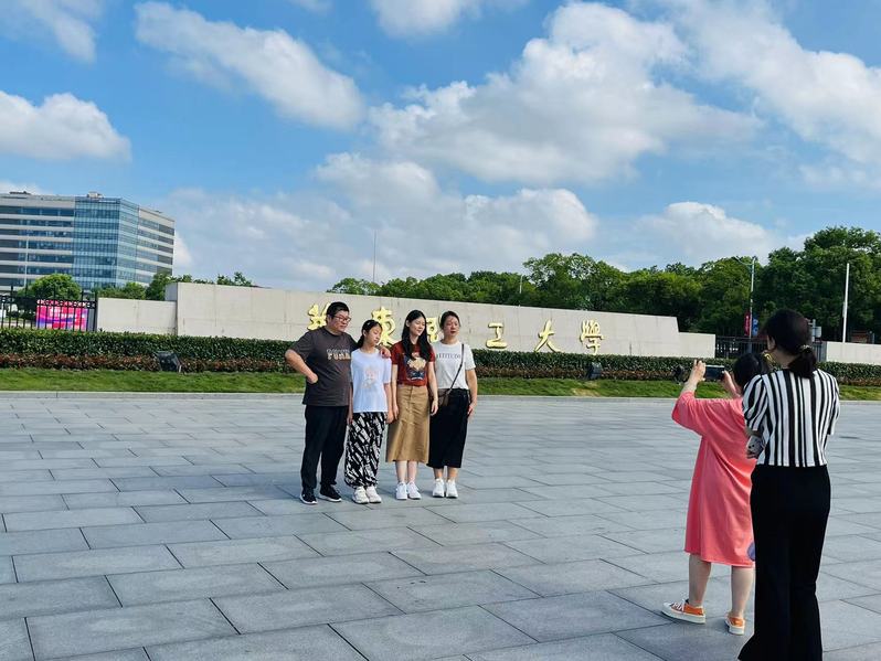 新生与家长在华理校门口、迎新标志牌前“打卡”合影