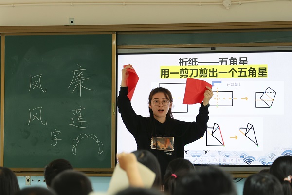 如何将传统文化融入教学,打造高效有趣的课堂?自成为研支团一员后,聚焦教学主业,王桐予开始动起了脑筋。去年10月,王桐予与正在云南寻甸开展教学活动的研支团成员取得联系,并在他们的帮助下开展了系列“剪纸云课堂”,不仅为仁德一小与仁德四小的孩子们带去了丰富多彩的课堂实践,也激发了孩子们对传统文化的浓厚兴趣。在华理附小实习实践期间,她策划开展了融合理论与实践的非遗剪纸午会课堂,让孩子们感受“指尖上的传统技艺”。