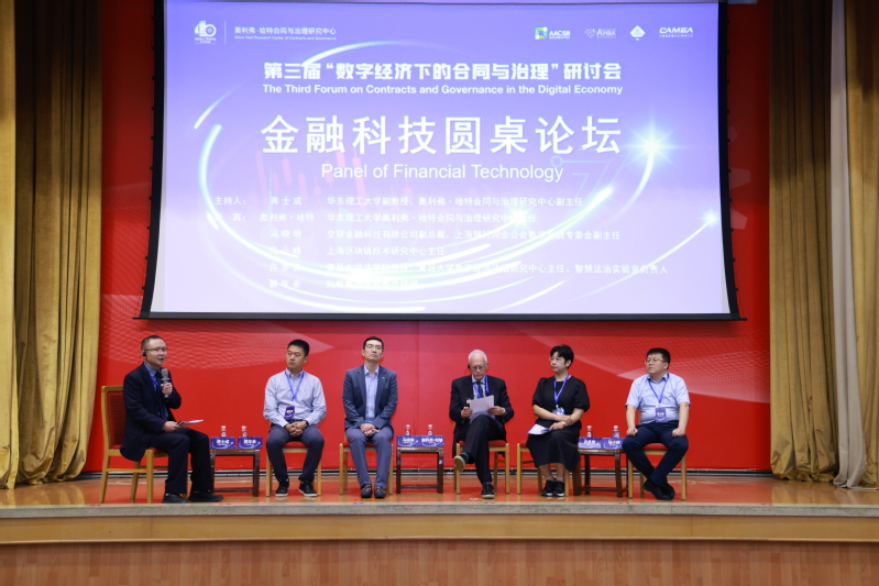 金融科技圆桌论坛环节,奥利弗·哈特教授、冯晓明副总裁、上海区块链技术研究中心主任马小峰、复旦大学法学院教授许多奇和蚂蚁集团合规部总经理蔡年余共同参与了研讨。奥利弗·哈特合同与治理研究中心副主任蒋士成主持圆桌论坛。