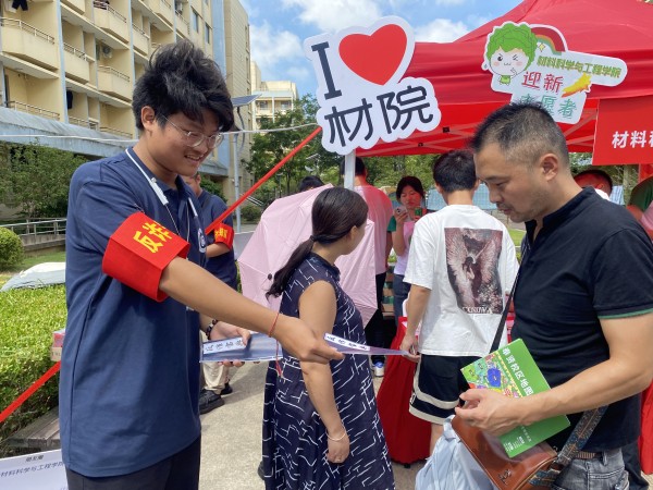 一组队员在民警的带领下深入大一新生宿舍。而在化工学院新生报到处,另一组队员们奇思妙想借助学院吉祥物的魅力,头戴Q版吉祥物与学院迎新生的同学们一同开展活动。