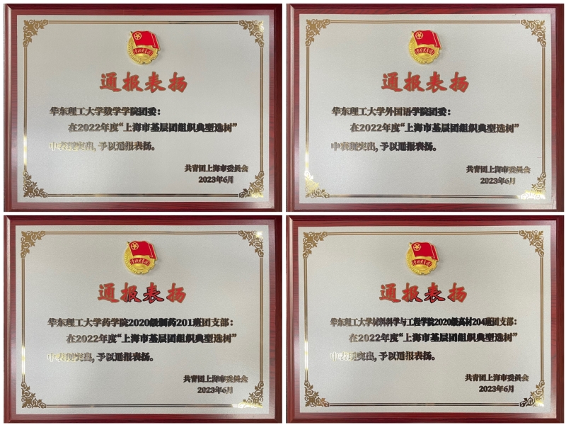 近日,共青团上海市委对上海市基层团组织先进集体和个人发布通报表扬,其中,我校数学学院团委、外国语学院团委入选2022年度“上海市基层团组织典型选树”专项工作团委选树名单,药学院制药201团支部、材料科学与工程学院高材204团支部入选2022年度“上海市基层团组织典型选树”专项工作团支部选树名单,数学学院团委书记李莹、外语学院团委书记孙阔、药学院制药201团支部书记谢思远、材料学院高材204团支部王卓娅入选2022年度“上海市基层团组织典型选树”专项工作个人选树名单。