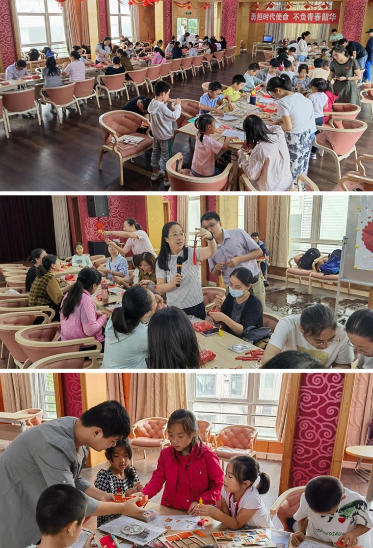 在接下来的亲子DIY环节,小朋友们在志愿者们的帮助下展开了拼图大比拼。红船、火箭、天安门……一个个精致的模型呈现在大家面前。家长们则在王以群老师的指导下,动手编织精美的中国结挂件。