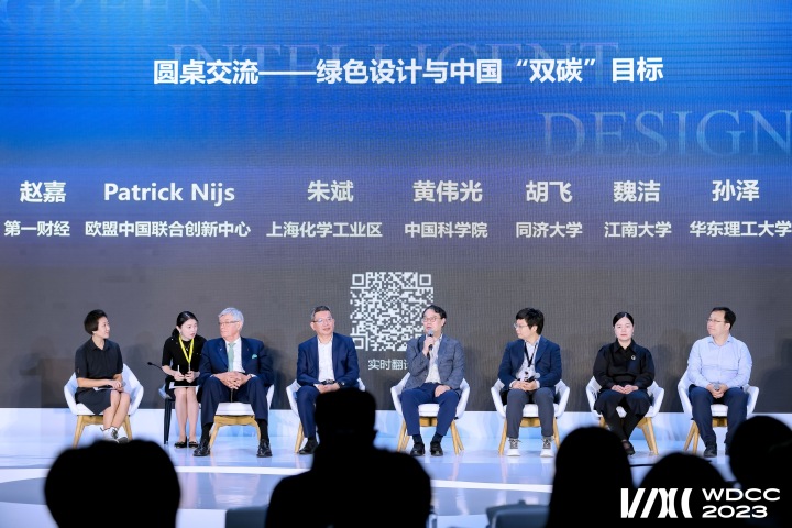 本次论坛还进行了两场精彩的圆桌对话。第一场圆桌对话以“绿色设计与中国‘双碳’目标”为主题。欧盟中国联合创新中心联合发起人Patrick Nijs、上海化学工业区副主任朱斌、中国科学院上海高等研究院原副院长黄伟光、同济大学创意设计学院院长胡飞等嘉宾就“中国双碳目标下的挑战与机遇,关键领域,以及国际合作的前景”“双碳导向下,高校在人才培养和前沿领域的布局和规划”等问题展开了充分讨论。
