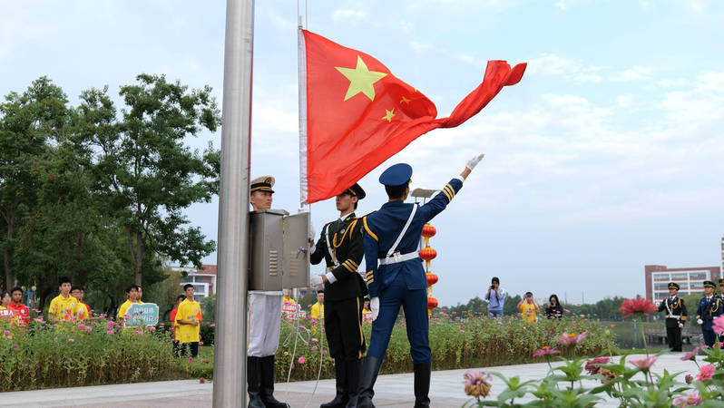 伴着国歌雄壮的旋律,五星红旗在朝阳下缓缓升起,迎风舒展,现场庄严肃立,全体师生向国旗行注目礼,深切表达对祖国的无限热爱和崇高敬意。