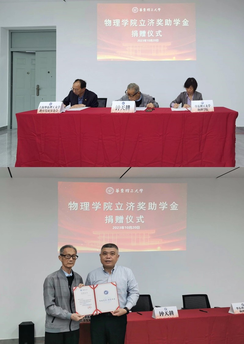 10月20日,学校“立济奖助学金”捐赠仪式在物理学院举行。校党委常委、副校长李涛出席并讲话。我校退休教师、捐赠人钟天耕,校友与发展联络处处长、上海华东理工大学教育发展基金会秘书长李建伟,物理学院党委书记钮月萍,离退休工作党委副书记、离退休工作处副处长热核,以及物理学院退休教师代表等出席活动,捐赠仪式由物理学院党委副书记兼纪委书记吴舜主持。