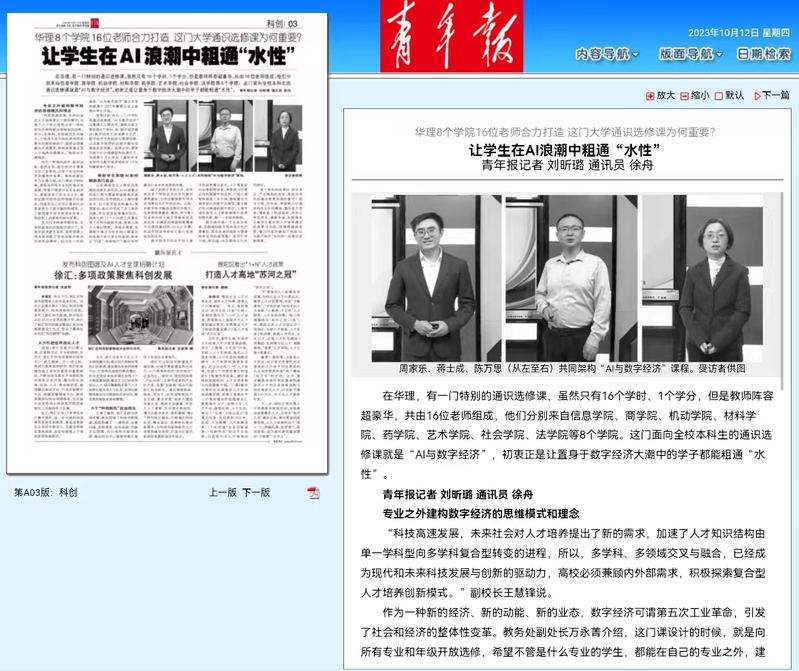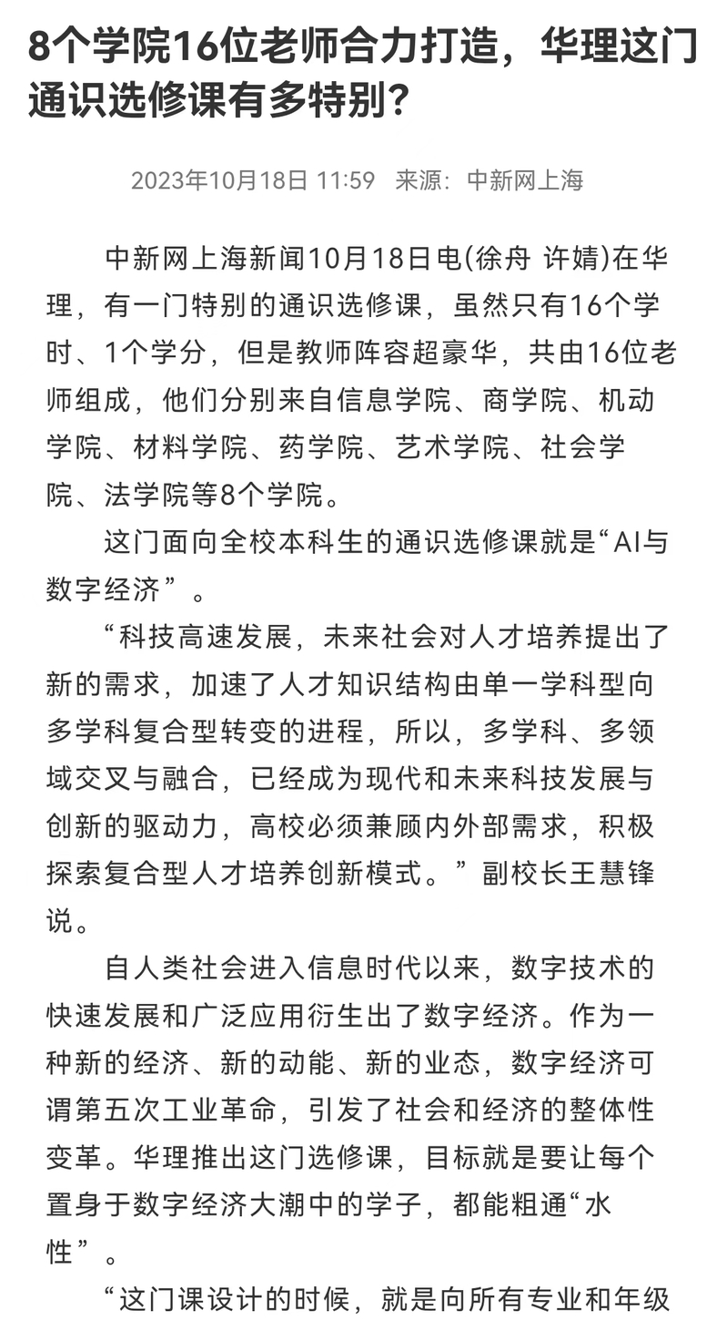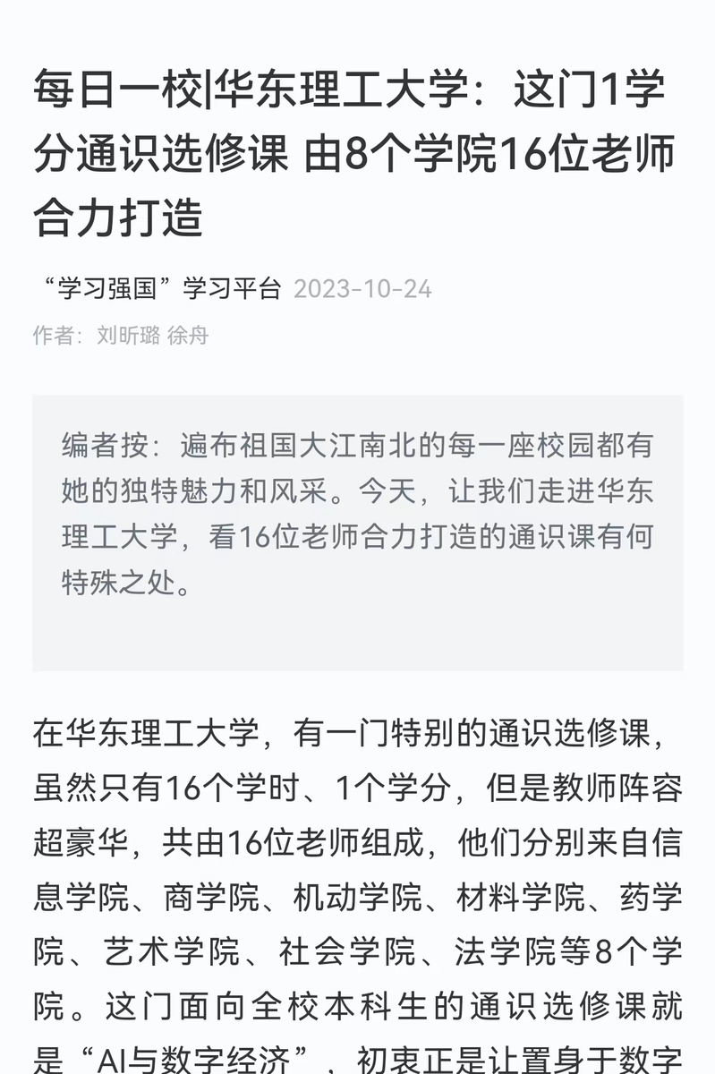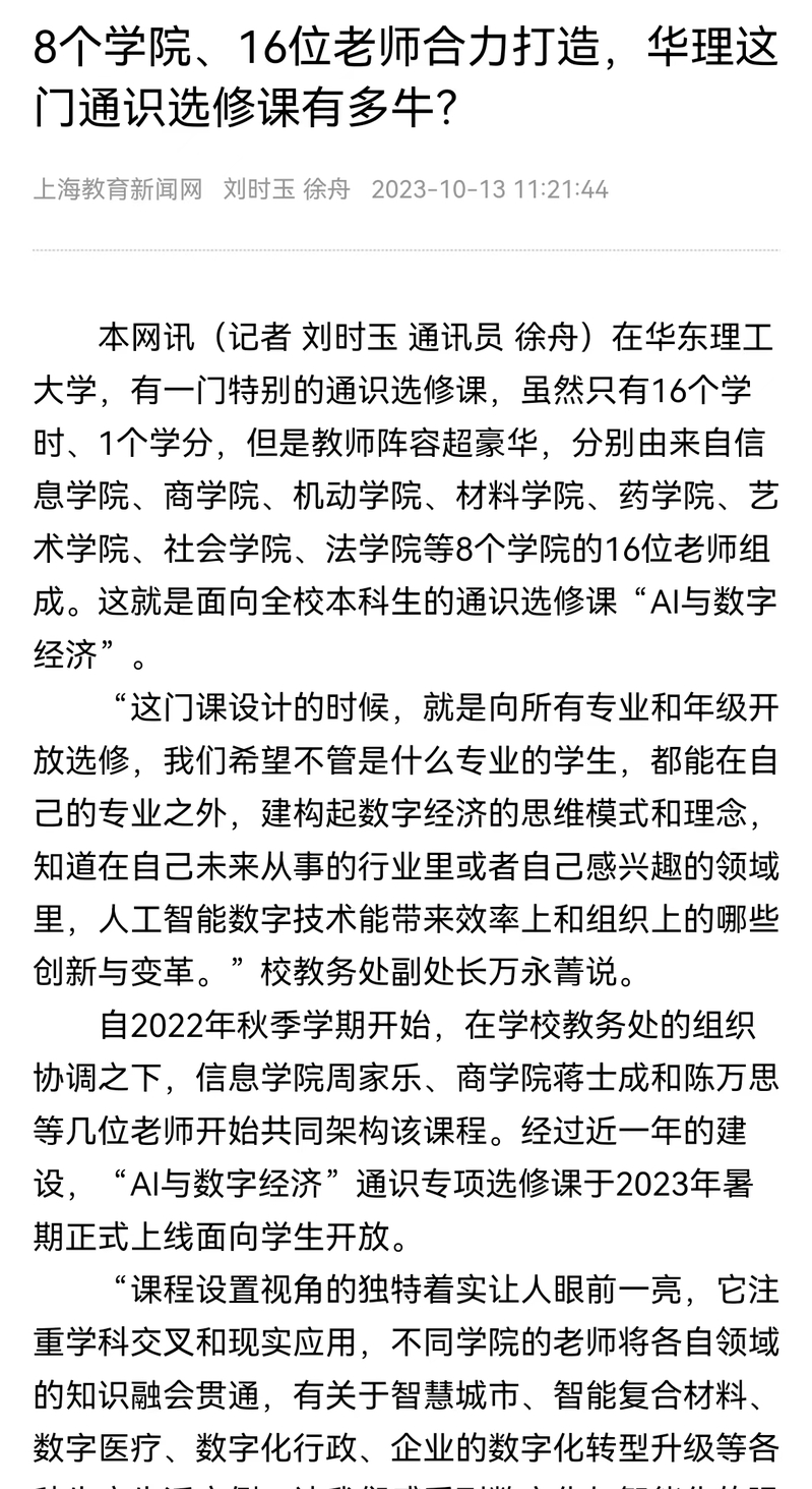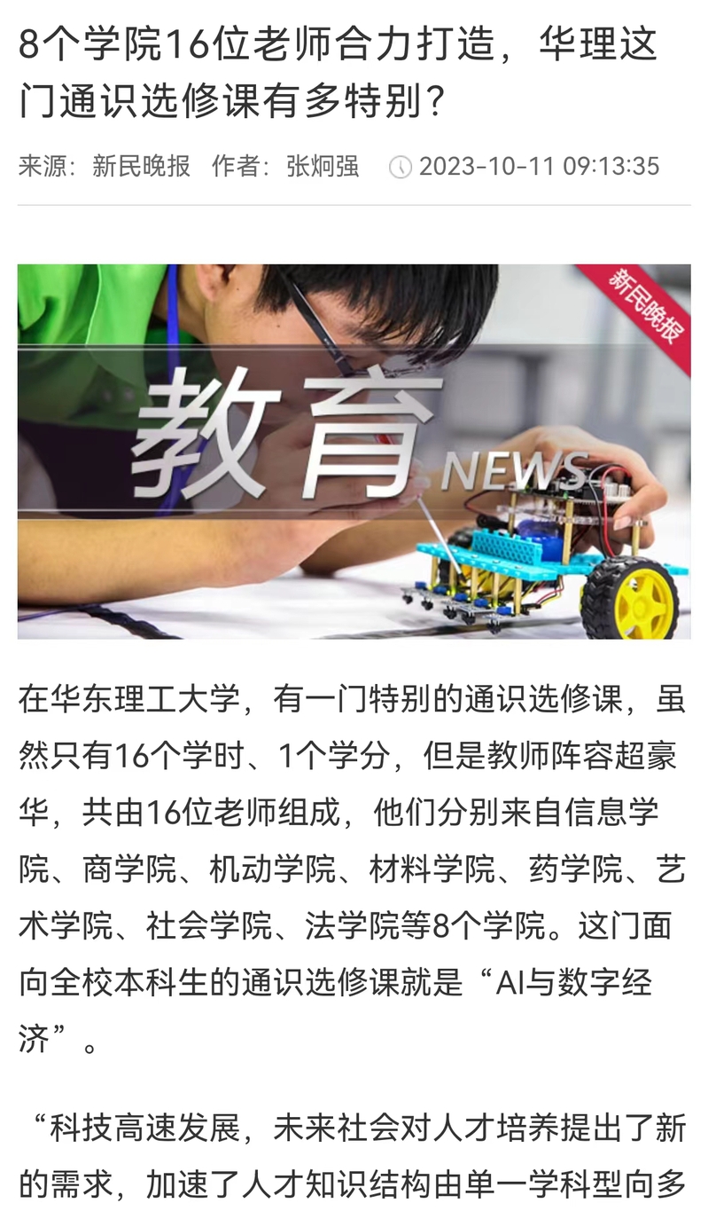 华理积极探索复合型人才培养创新模式,面向全校本科生开设“AI与数字经济”通识选修课,让每个置身于数字经济大潮中的学子,都能粗通“水性”。中国新闻网、学习强国、新民APP、《青年报》、上海教育新闻网、第一教育、青春上海、上海科技报、上海徐汇、新民周刊等近10家媒体对通识选修课相关情况进行了报道。本篇选取部分报道予以转载。