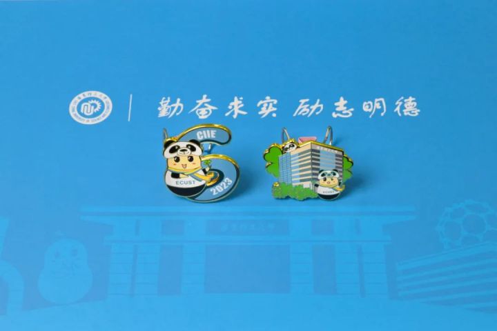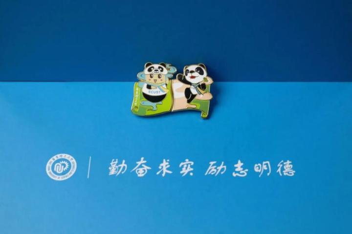 进博会三款定制徽章。徽章融合了华理的特色建筑——图书馆和大片四叶草,可爱的进宝趴在建筑物左上方,右下角的小梨高举双手向世界招手。数字“6”象征着第六届进博会,小花梨手持象征幸运的四叶草,装扮成可爱的进宝闪亮登场,在世界舞台上展现华理人的风采。