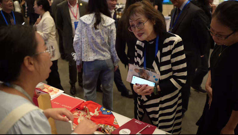 展示现场,华东理工大学“老字号·新国潮”大赛组委会整合了4家各具特色且不同领域的老字号品牌进行现场展示,对老字号品牌及老字号出海等进行了详细解答,对“老字号新国潮”创新设计大赛进行了宣传和展示。在展区,通过现场大屏回顾了“中新老字号品牌创新大会”的精彩瞬间,展摊摆放了众多老字号的创新产品,项目团队介绍了中新品牌大会的现状,分享了好创意大赛中获奖的精彩作品,并以老字号产品为载体,设置了品鉴、体验环节。体验加讲解的互动活动吸引了众多与会嘉宾的热情参与,来自不同地区的华裔一起感受老字号迸发的新活力,受到广泛好评。