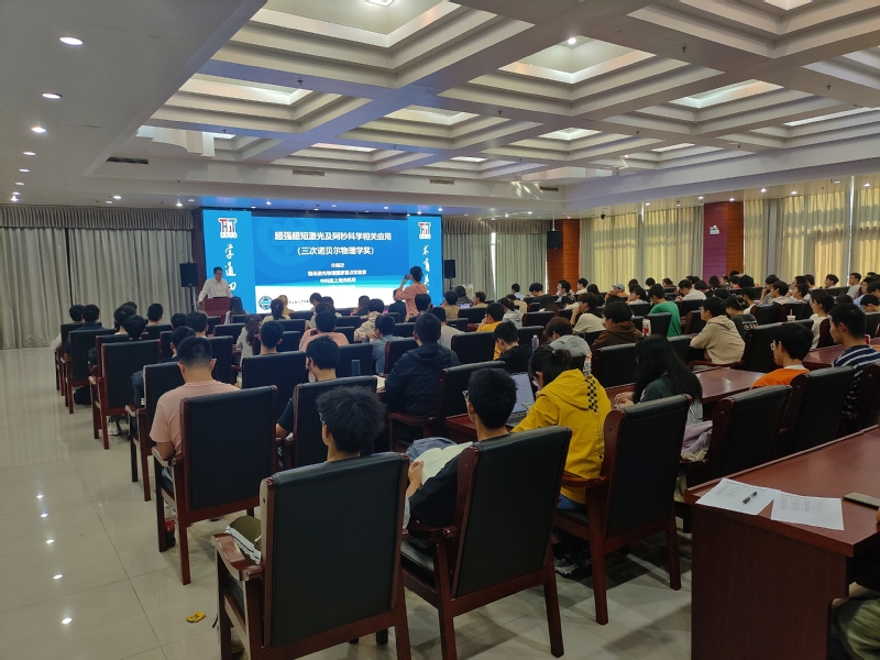 冷雨欣研究员从世界上第一台激光器的发明讲起,围绕激光的功率和脉宽两个维度,详细讲述了国内外超强超短激光的发展历程和科学意义。“超强超短激光被认为是人类已知的最亮光源,能在实验室里创造出此前只有在核爆中心、恒星内部、黑洞边缘等才可能有的极端条件”“脉冲压缩后宽度达到飞秒量级,相当于将10个太阳辐射到地球的总功率汇聚到一根头发丝这样的尺度”“可用于制造台式化电子加速器、产生超快X射线源,研制激光质子刀以治疗癌症,以及产生反物质、研究天体物理”……冷雨欣研究员娓娓道来的这些信息强烈地震撼了在场师生。为了讲解清楚超强激光如何实现,冷雨欣研究员还给大家介绍了2018年度诺贝尔物理学奖关于啁啾脉冲放大技术(CPA)的相关内容。