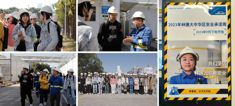 第一站,师生实地参观了林德气体工厂。第一次如此亲近空气分离装置,那些曾经在课本上的知识都“活”过来了,同学们踊跃提问,与工程师展开热烈的交流讨论。值得一提的是,工厂一行受到华理校友的热情接待。2021届华理校友胡碧涵毕业后入职林德,经过两年的成长,已经成为林德工厂的“安全管理”明星人物,厂区内随处可见她的海报。胡碧涵热情地向同学们介绍:“在母校学到的专业知识有效助力了我的职业成长,感谢母校的培养,使我得到知识和技能,实现了理想就业。”