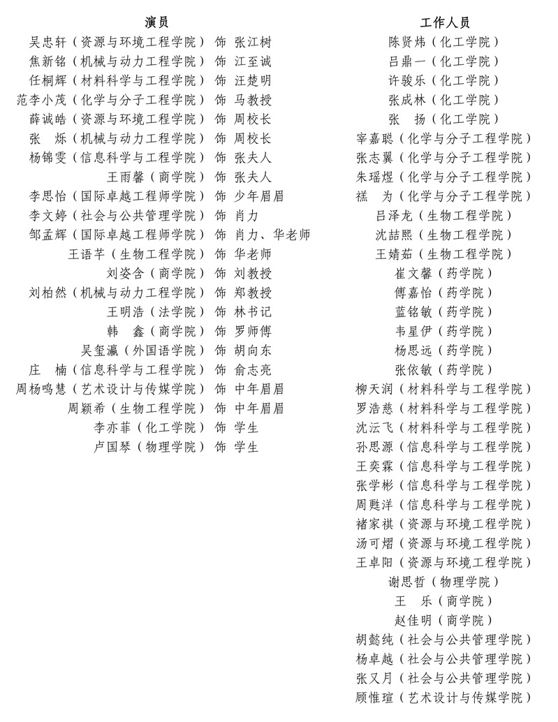 作为剧目的幕后工作者,导演、舞监、场务、灯光、音效等等工作人员共同为剧目的完整呈现提供了必不可少的支撑。在本轮演出中,我校大学生艺术团和话剧团、校园文化部、小花梨新媒体工作室等部门学生骨干分别在台前幕后承担了重要角色(后附演职人员名单)。后续,大师剧《更生》排演将作为美育思政实景课堂建设的重要途径,持续开放学习实践的舞台,将张江树校(院)长爱党尽责、为国奉献的火种不断延续,希望一代代华理学子接过奋斗的接力棒,坚定成长为有理想、敢担当、能吃苦、肯奋斗的新时代好青年,“勤奋求实,励志明德”的精神财富宛如不断壮大的生命之树,日益“更生”。