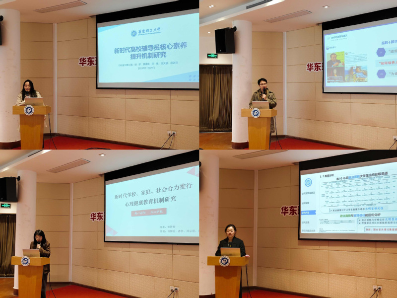 在阶段汇报交流会上,四个研修小组代表围绕高校培育时代新人机制、新时代高校辅导员核心素养提升机制、学校家庭社会合力推行心理健康教育机制和大学生网络社会态度四个选题,从研究背景及意义、研究思路及方法、研究结论和建议等方面汇报了开营半年以来取得的进展,分享了对于研究课题的理解以及“行动学习”的感悟和收获。