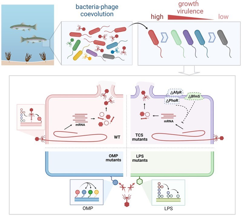 基于上述研究背景,本研究以重要的海洋病原菌杀鲑气单胞菌为研究对象,解析了其中不同的噬菌体抗性模式以及它们在时间尺度上如何驱动细菌的适应性变化。本研究鉴定了11个噬菌体抗性基因并按其功能分为3类:脂多糖(LPS)、外膜蛋白(OMP)和双组分系统(TCS)。在细菌与噬菌体的长期共进化实验中,研究人员发现,LPS和OMP的共突变是细菌抵抗噬菌体的主要方式,并且由于它们的抗性代价较低因此它们的突变在共进化中被保留。同时,研究人员首次发现细菌通过TCS抑制噬菌体转录而导致了不完全的噬菌体抗性,但是难以在共进化中被富集。通过对细菌群落的表征,研究发现:细菌在抵抗噬菌体初期的生长和毒力快速下降,表现为军备竞赛动态;随后趋于稳定,表现为波动选择动态。本研究的发现解析了共进化中海洋细菌群落动态变化过程和噬菌体抗性的进化权衡问题,有助于进一步在时间尺度上了解海洋微生物的相互作用,也为海洋病原菌的噬菌体治疗提供了理论支持。