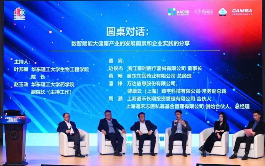 圆桌论坛环节由华东理工大学生物工程学院院长叶邦策和药学院副院长(主持工作)赵玉政联合主持。浙江善时医疗器械有限公司董事长边俊杰、启东东岳药业有限公司总经理蔡畅、万达信息股份有限公司、健康云(上海)数字科技有限公司常务副总裁潘铮、上海道禾长期投资管理有限公司合伙人周灏共同围绕“数智赋能大健康产业”主题,就大健康产业的未来发展趋势、数字化转型和智能化升级等方面进行了探讨,并就校企双方产业人才的培养、产教融合的路径和方法等内容进行了深入交流。