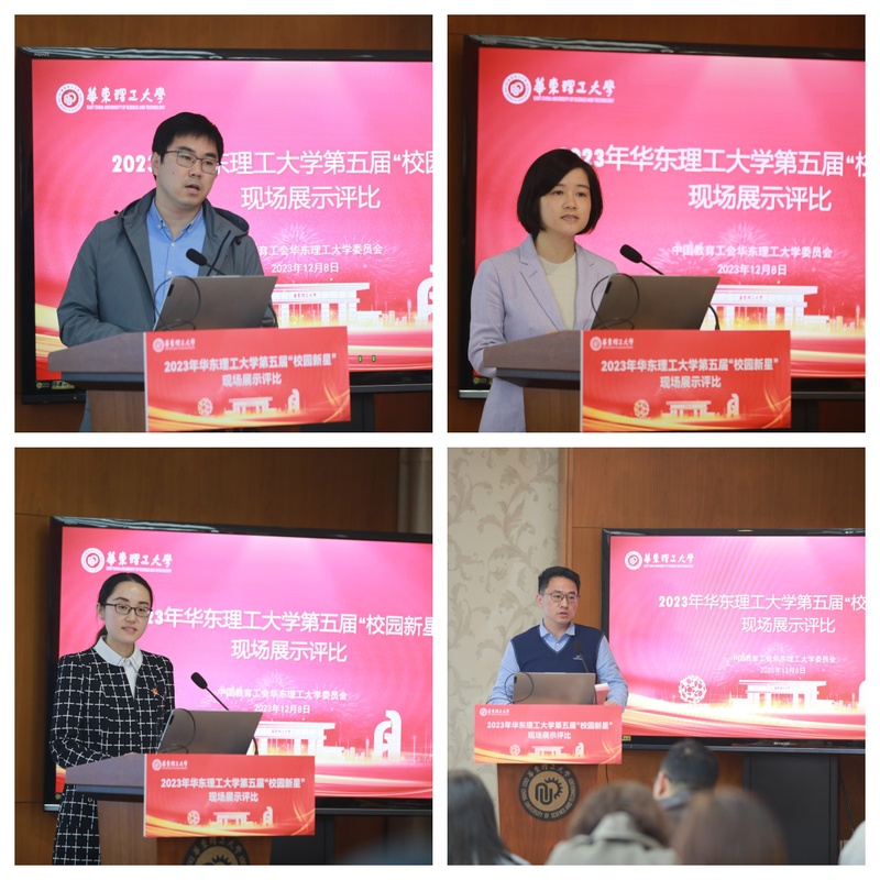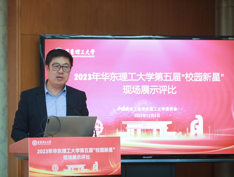 为深入学习宣传贯彻落实党的二十大精神,贯彻落实中国工会第十八次全国代表大会精神,全面落实立德树人根本任务,为推进学校“双一流”建设作出新的更大贡献,校工会于12月8日在和平楼第二会议室开展华东理工大学第五届“校园新星”评选活动。校党委副书记沈海涛出席活动并讲话。来自上海市教育工会、上海交通大学、华东师范大学、上海师范大学、华东政法大学的5位特邀校外评委,党委办公室、校长办公室等11个职能部处负责人组成的校内评委,与26名“校园新星”候选人一起参加了展示交流活动。活动由校工会副主席叶俊男主持。