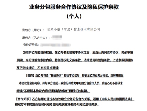 入职前,记者曾收到一条自称为瑞幸人力服务供应商“位来无忧”发送的系统短信,并按提示上传了身份证、银行卡、婚育情况与紧急联系人等个人资料。几天后,“小猎宁波”通过短信发送了一份电子版《业务分包服务合作协议及隐私保护条款》,甲方为“位来小猎(宁波)信息技术有限公司”,乙方为记者。此外,该协议中并没有提及即将从事的工作岗位、内容、地点、时间、薪资等任何具体信息。