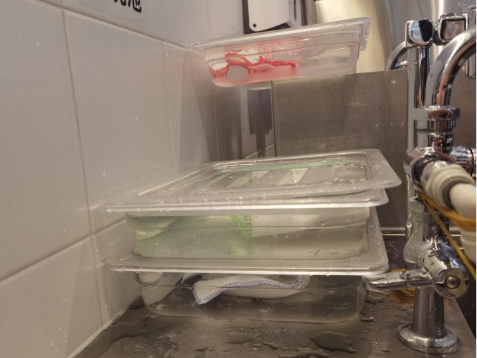 至于橡胶手套,长度超过手腕、接近手肘,但比清洗池与消毒池的深度短。由于规定浸泡在消毒池内的器具必须完全被消毒水覆盖,所以大家会把消毒水倒满池子,这样也能浸泡更多器具争取尽早下班。不过,拿取物品时手套就容易进水。