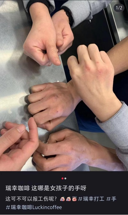搜索“瑞幸”和“烂手”这组关键词,一张张伤痕累累的手部照片出现在社交平台上。很难想象就是这一双双手制作了爆款生椰拿铁与酱香拿铁,撑起了全国近15000家瑞幸咖啡门店。