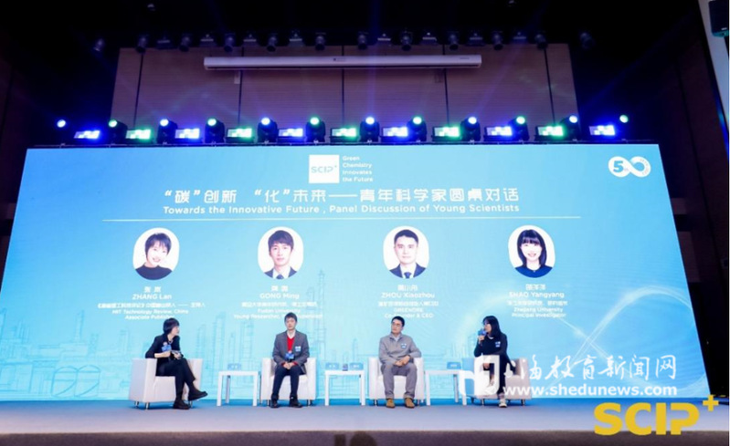 本次活动中,在“‘碳’创新,‘化’未来——青年科学家圆桌对话”环节,复旦大学青年研究员、博士生导师龚鸣,浙江大学研究员、研究组长邵洋洋,瀜矿环保联合创始人兼CEO周小舟三位来自不同领域的青年科学家围绕大赛“未来材料、未来能源和未来碳循环”主题共同探讨绿色未来。论坛由《麻省理工科技评论》中国副出版人张岚主持。