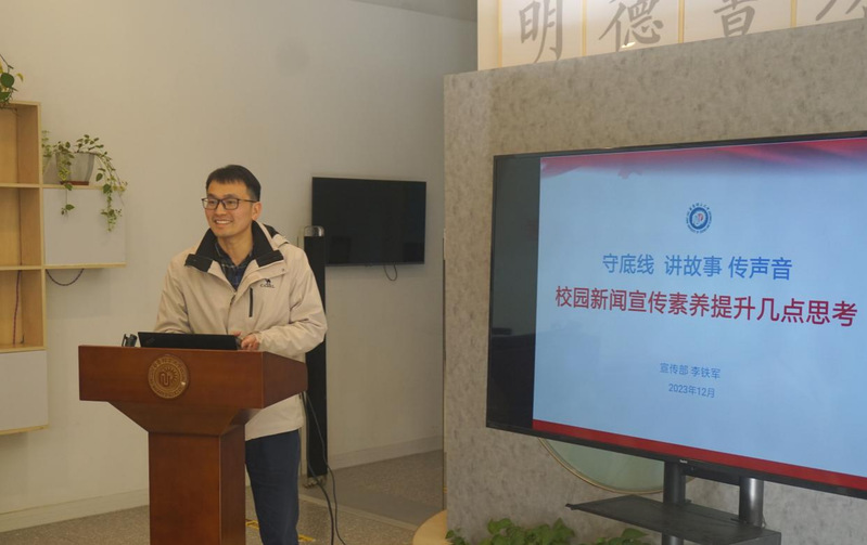 会议邀请党委宣传部李铁军老师作了题为“校园新闻宣传素养提升几点思考”的经验分享,主要围绕新闻写作的稿件类型、基本技巧、注意事项和新闻摄影拍摄技巧等方面进行了介绍,并通过对高质量的新闻宣传案例进行剖析和讲解,交流探讨提高新闻宣传工作技能与水平的思考。
