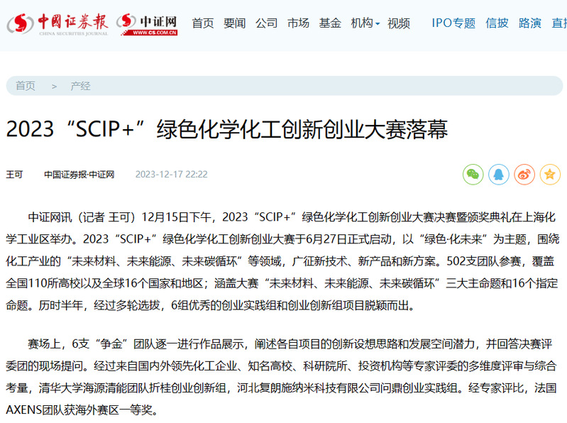 【中证网】2023“SCIP+”绿色化学化工创新创业大赛落幕