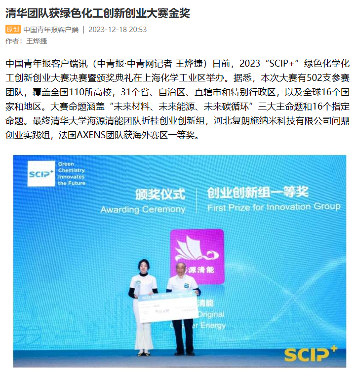 【中国青年报客户端】清华团队获绿色化工创新创业大赛金奖