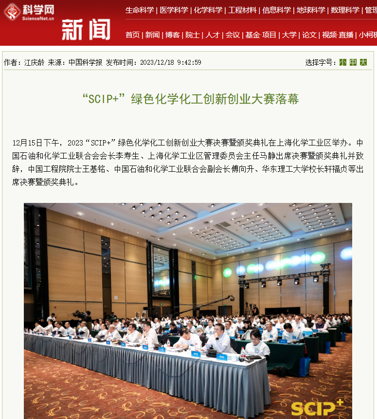 12月15日,由中国石油和化学工业联合会、中国化工学会、上海化学工业区和华东理工大学共同主办的2023“SCIP+”绿色化学化工创新创业大赛决赛暨颁奖典礼在上海化学工业区举办。光明日报客户端、中国青年报客户端、中国教育报客户端、中国新闻网、科学网、中化新闻、中国证券报、新民客户端、东方网、上海教育新闻网、上海科技报、劳动观察、话匣子、上海热线、东方财经浦东频道等10余家媒体进行了相关报道。