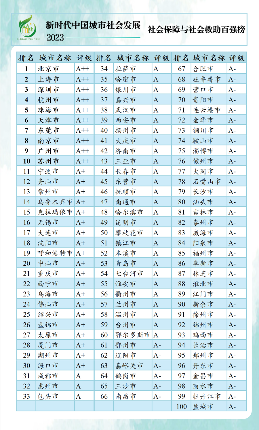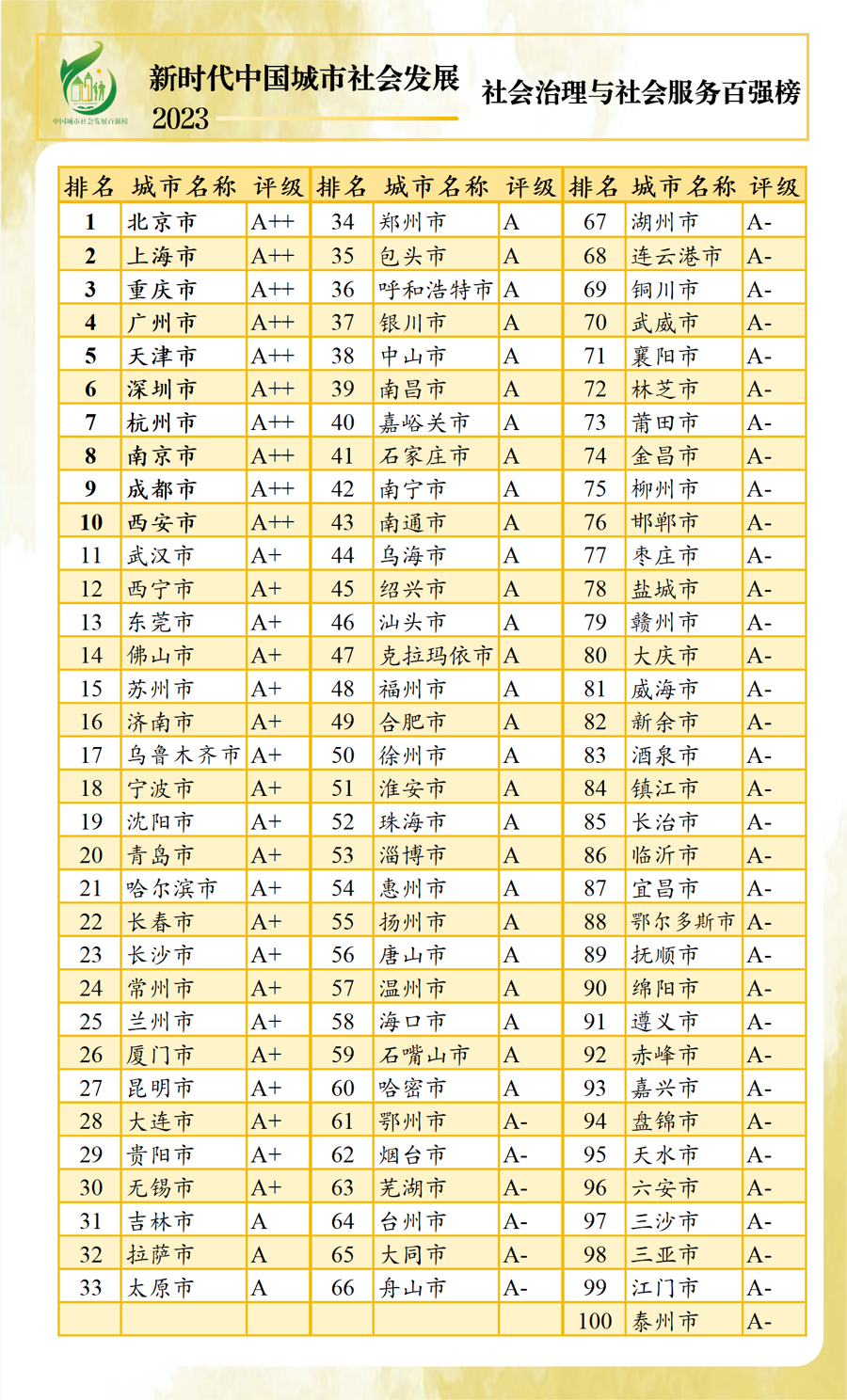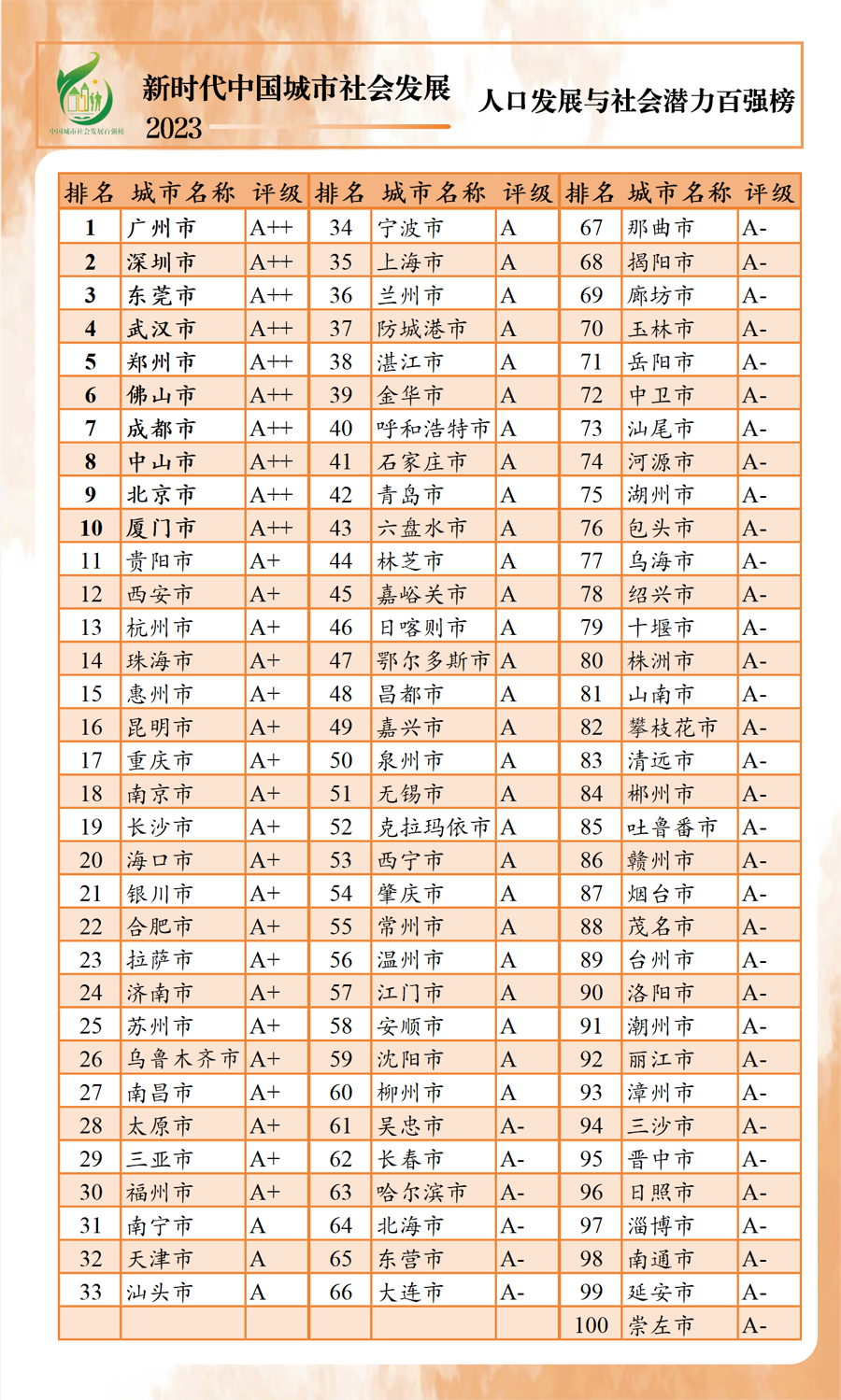 以人民的生活需求、生计需要和生机活力为中心,强调城市居民的获得感、幸福感和安全感。“新时代中国城市社会发展指数暨百强榜(2023)”25日上午在沪线上发布,利用各类统计年鉴和统计公报数据,对全国297个地级以上城市进行了排名,前百名划分“A++、A+、A、A-”4个评级区间。按省份看,除直辖市外,广东、江苏、浙江百强上榜最多,均有11个城市。