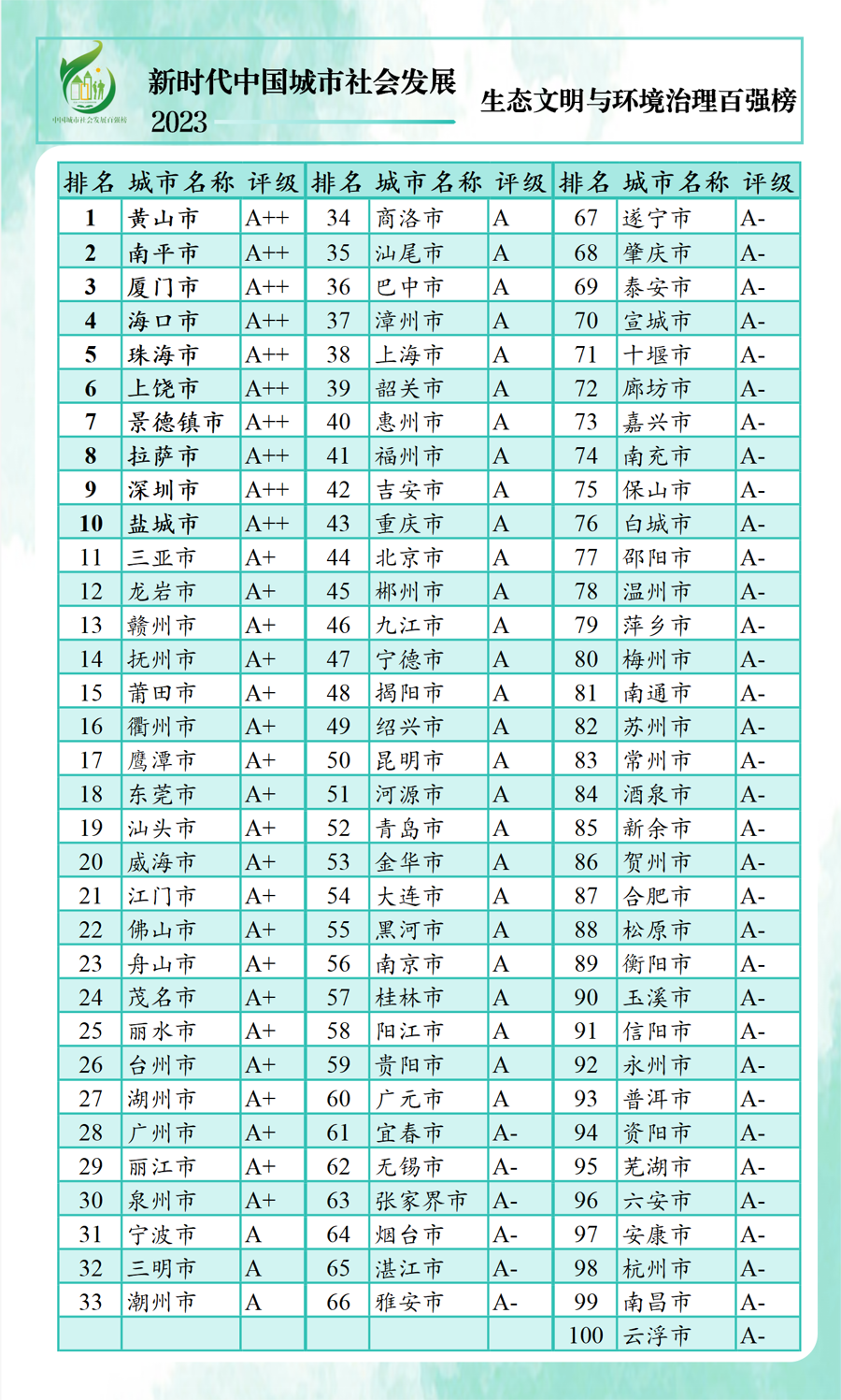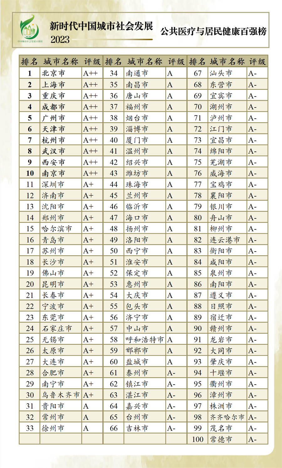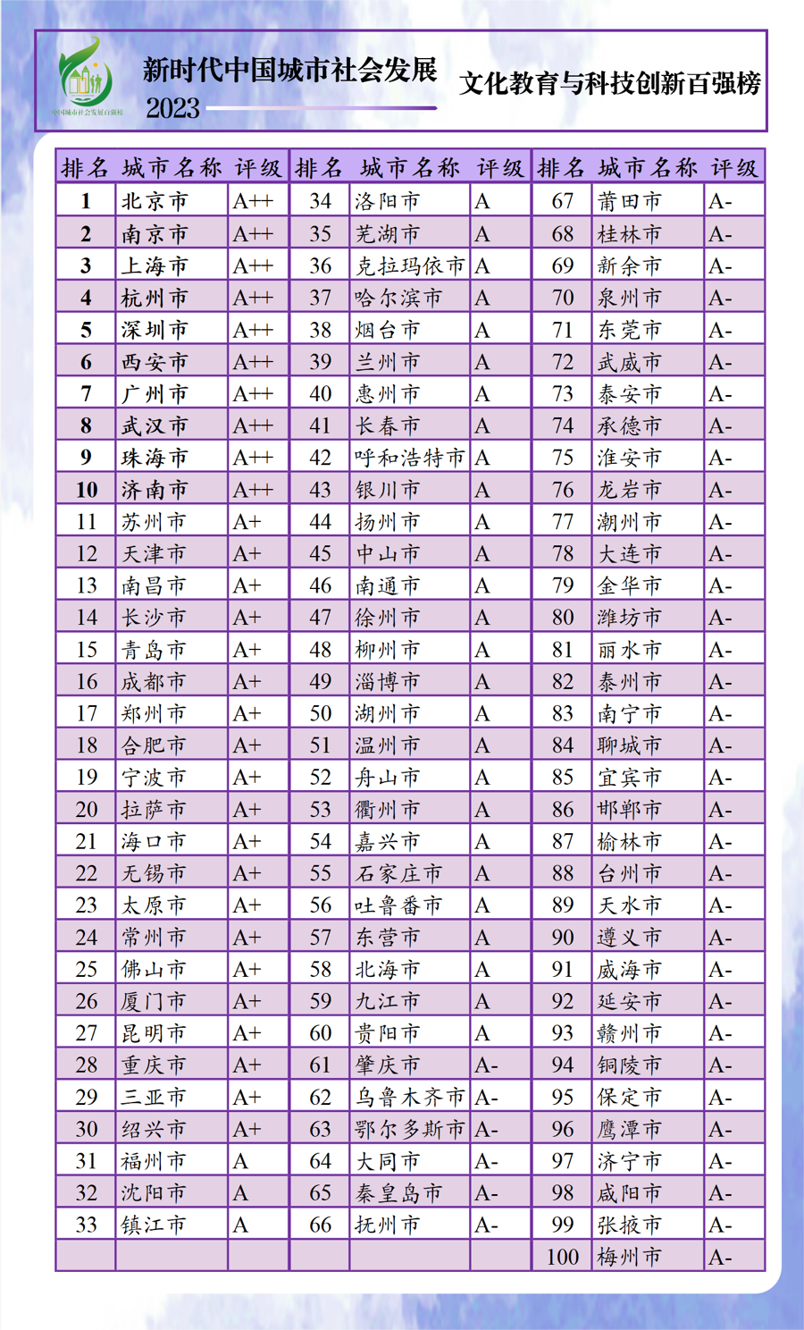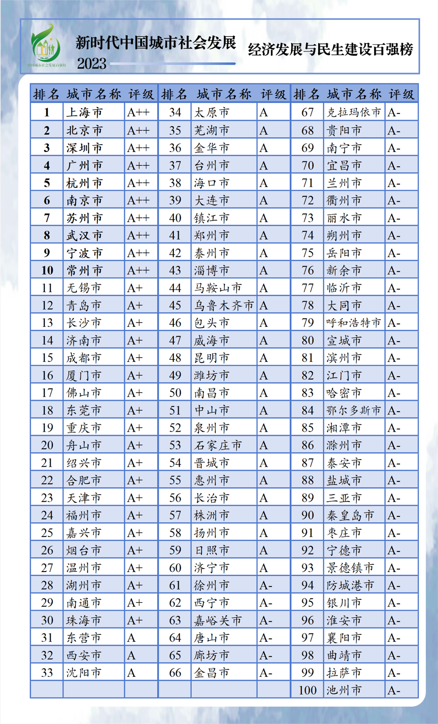 以人民的生活需求、生计需要和生机活力为中心,强调城市居民的获得感、幸福感和安全感。“新时代中国城市社会发展指数暨百强榜(2023)”25日上午在沪线上发布,利用各类统计年鉴和统计公报数据,对全国297个地级以上城市进行了排名,前百名划分“A++、A+、A、A-”4个评级区间。按省份看,除直辖市外,广东、江苏、浙江百强上榜最多,均有11个城市。