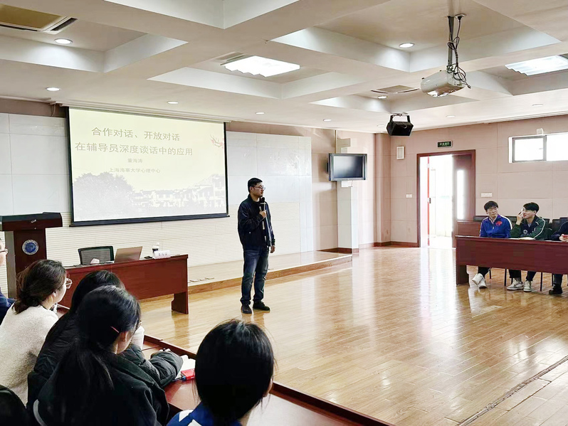 为深入学习宣传贯彻党的二十大精神,积极推动学生心理健康教育工作,强化“三全”育人工作格局,近日,学校特邀上海海事大学心理咨询中心主任董海涛副教授开展“赋能提效 为心导航”心理健康教育大讲堂之“合作对话 开放对话”专场,旨在更好地守护学生心理健康,促进其成长与发展。活动吸引了来自各学院30余名研究生导师、班导师、辅导员以及专兼职心理咨询师的积极参与,党委学生工作部(处)副部(处)长饶志雄主持活动。