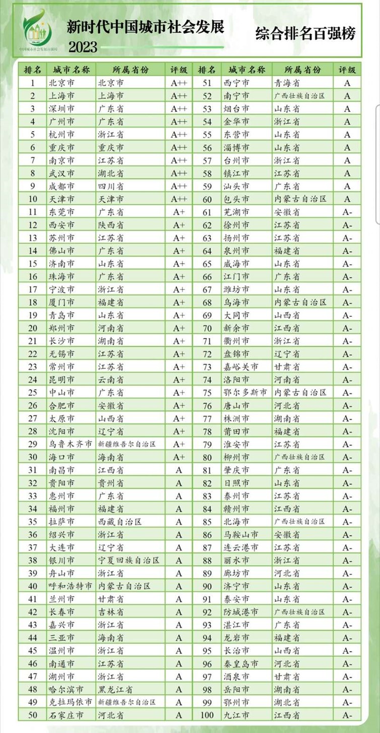 课题组利用可获得的2022年各类统计年鉴和统计公报数据,对全国297个地级以上城市进行了排名。中国城市社会发展指数综合排名前十强城市分别为北京市、上海市、深圳市、广州市、杭州市、重庆市、南京市、武汉市、成都市、天津市。排行榜前十位城市有七个城市来自京津冀、长三角和珠三角三大城市群,重庆、武汉和成都等三个中西部城市表现优异。