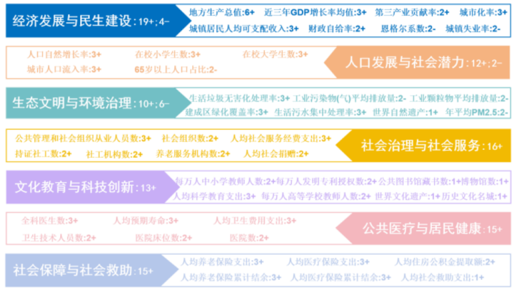 课题组结合“十四五”期间城市社会发展的新要求和二〇三五年远景目标,对标人民城市的“人民性”和新发展阶段的社会建设新形势,对指标体系进行调整优化。2023年中国城市社会发展指标体系是综合反映城市社会发展与民生福祉的系统性指标,在长期关注城市社会治理、社会保障、公共医疗以及生态文明的基础上,更加重视城市的经济发展与民生建设、文化教育与科技创新,更加关注城市经济社会的可持续发展。课题组特别强调经济持续稳定增长、社会充分就业和城市文化传承对城市社会可持续发展的重要性。