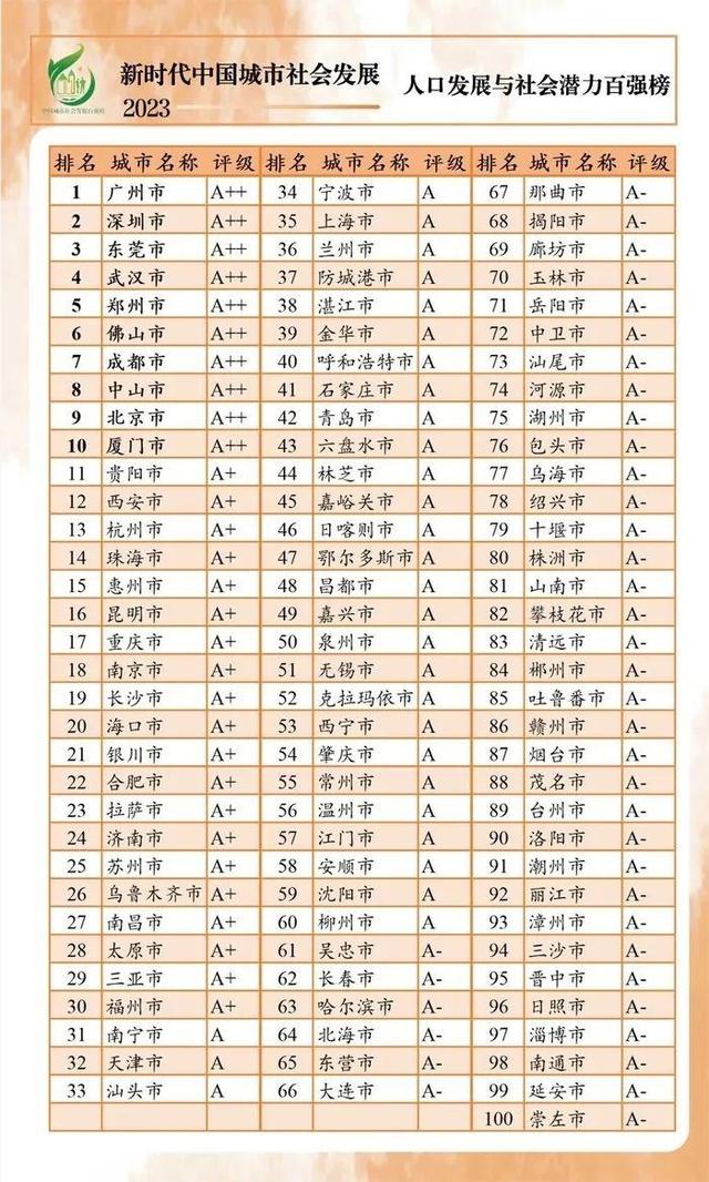 上榜百强城市分为A++级(1-10名)、A+级(11-30名)、A级(31-60名)、A-级(61-100名)四个等级。2023年城市社会发展指标体系包括7个一级指标、47个二级指标,从多个层面对297个地级以上城市的社会发展状况进行综合评价。一级指标分别为经济发展与民生建设、人口发展与社会潜力、生态文明与环境治理、社会治理与社会服务、文化教育与科技创新、公共医疗与居民健康、社会保障与社会救助。